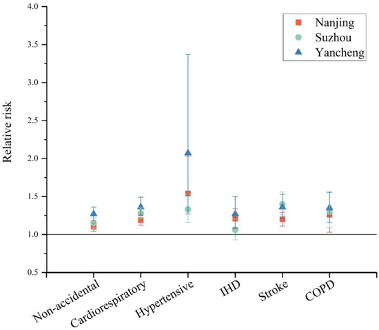 This study found that extreme heat was significantly associated with an increased risk of mortality from nonaccidental and cardiorespiratory diseases. The findings on cause-specific mortality risk showed that people suffering from cardiorespiratory diseases are vulnerable. The study estimated stronger mortality risks for cardiorespiratory diseases such as hypertensive diseases, stroke and COPD compared to the total mortality in each city. The findings are generally consistent with many previous studies [48,51]. The estimated RRs associated with extreme heat (Nanjing, nonaccidental: 1.10, cardiorespiratory disease: 1.19, hypertensive disease: 1.54, IHD: 1.21, stroke: 1.20, and COPD: 1.26; Suzhou, nonaccidental: 1.15, cardiorespiratory disease: 1.28, hypertensive disease: 1.33, IHD: 1.06, stroke: 1.40, and COPD: 1.30; Yancheng, nonaccidental: 1.27, cardiorespiratory disease: 1.36, hypertensive disease: 2.07, IHD: 1.27, stroke: 1.36, and COPD: 1.35) were similar to those in a previous study based on 272 cities in China, which reported a RR of 1.16 for nonaccidental diseases, 1.22 for cardiovascular disease, 1.36 for respiratory disease, 1.24 for stroke and 1.26 for COPD [51]. Ma et al. [48] reported an RR of 1.77 for hypertensive disease. Respiratory symptoms can be linked to the thermoregulatory response and, possibly, the direct effect of breathing hot air, which can lead to increased airway resistance and bronchoconstriction [10]. The prevalence of cardiorespiratory diseases (such as hypertensive disease, IHD, stroke and COPD) may increase the susceptibility to heat waves due to the increased load on the circulation system that is needed to maintain a normal body temperature [6].
