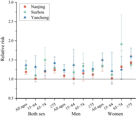 The mortality risks of cardiorespiratory disease for different sex and age groups are shown in Figure 6. The results showed that age and sex factors can modify the mortality risks. A positive association between heat and cardiorespiratory mortality was observed for both men and women, and the effect was stronger among women than men in all ages. The mortality risks of sex and age showed heterogeneity in different cities. The mortality risk was highest in the oldest age group (≥75 years) in Nanjing (RR, 1.24; 95% CI, 1.16–1.32) and Yancheng (RR, 1.42; 95% CI, 1.28–1.58), whereas the age group of 65–74 years was affected the most in Suzhou (RR, 1.29; 95% CI, 1.21–1.36). In the age group of 15–64 years, the effect of extreme heat is stronger among men than women in Suzhou and Yancheng. This might be due to outdoor activities and the occupational division of labor [17].