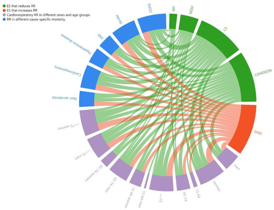 The study focused on the mediating effect of the HWMI between ESs and mortality risk. This study wanted to explore how ecosystem services affect mortality risk by influencing heat waves. Tables S11 and S12 show the specific pathways of how ESs affect cause-specific mortality RR and different groups of cardiorespiratory mortality RR, respectively. The numbers in Tables S11 and S12 refer to the size of the effect of ESs on the HWMI (a) and the direct effect of the HWMI on RR (b). The WY, CS, NDVI and COHESION have an inhibitory effect on the HWMI, thus limiting the heat-related health risks. However, the SHDI has a positive effect on the HWMI and mortality risks. The results show that the effect of CS on the HWMI is strongest, followed by the SHDI, COHESION, NDVI and WY. The results of the mediating effects are shown in Figure 7, and the thickness of a line represents the size of the mediating effect. Table 2 lists the results of the mediating effects ) from Figure 7. The numbers indicate the size of the effect of ESs on RR through affecting HWMI. Generally, the effects on cardiorespiratory disease, stroke and COPD are stronger than on other cause-specific diseases. The mortality risks for the elderly and women are more affected by ESs.