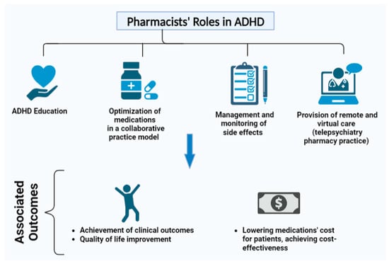 In general, clinical pharmacy gains more attention and characterizes pharmacists’ main role in providing services such as medication reconciliation, therapeutic education, and taking part in multidisciplinary teams to help optimize pharmacotherapeutic decisions for patients with neuropsychiatric disorders [28]. Concerning ADHD, pharmacists can play various roles in providing pharmaceutical care to patients with ADHD of various ages or at various stages of the disorder. Before confirming the diagnosis, pharmacists could notice potential ADHD symptoms through casual conversation or a more comprehensive consultation with a patient or caretaker and then refer the patient to receive a more formal evaluation from medical specialists. Following an ADHD diagnosis, the pharmacist can be a valuable resource for the patient regarding information and support, particularly if the patient or family struggles with a new diagnosis of ADHD due to the stigma linked to mental disorders or the stigma associated with using ADHD medication [7]. Pharmacists are also in the right place to provide medication management services for patients with ADHD and their caretakers to help them maximize the clinical benefit and manage the anticipated adverse outcomes [7]. Figure 1 displays pharmacist’s major roles in treating ADHD and its associated outcomes.