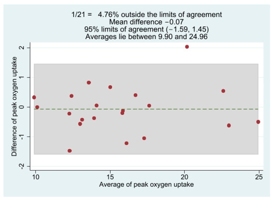 Bland-Altman plot for relative peak oxygen uptake response between the two exercise phases. Dashed line represents the mean bias, and highlighted zone indices are the limits of agreement (mean ± 1.96 standard deviation).