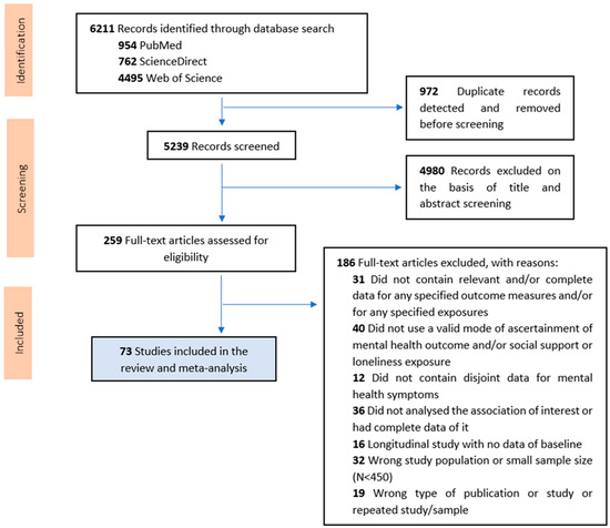 Thus, the aim of this study was to systematically review quantitative studies published from 2020 to 2022 exploring the associations of loneliness and/or social support with mental disorder symptoms (i.e., depression, anxiety, and post-traumatic stress) during the COVID-19 pandemic. In order to estimate the strength of the associations among these variables, we aimed to perform a statistical meta-analysis, so as to be able to objectively combine and analyse the results of the selected studies.