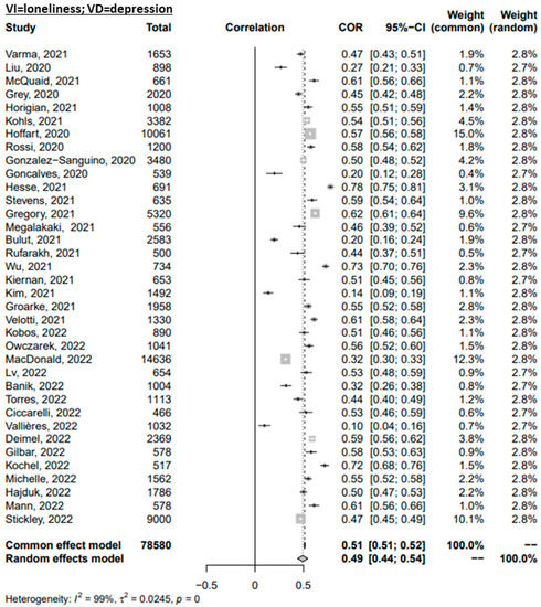 Forest plot of the Omnibus Test for the correlations of loneliness with mental disorder symptoms. References: Banik, 2022 [56]; Boursier, 2020 [59]; Boyraz, 2020 [60]; Bulut, 2021 [61]; Ciccarelli, 2022 [63]; Cordaro, 2021 [64]; Deimel, 2022 [65]; Gilbar, 2022 [70]; Gonçalves, 2020 [71]; González-Sanguino, 2020 [72]; Gregory, 2021 [73]; Grey, 2020 [74]; Groarke, 2021 [75]; Hajduk, 2022 [77]; Hesse, 2021 [78]; Hettich, 2022 [79]; Hoffart, 2020 [80]; Horigian, 2021 [81]; Kiernan, 2021 [87]; Kim, 2021 [88]; Kobos, 2022 [89]; Kochel, 2022 [90]; Kohls, 2021 [91]; Lim, 2022 [94]; Liu, 2020 [4]; Lv, 2022 [95]; MacDonald, 2022 [98]; Mann, 2022 [99]; McQuaid, 2021 [100]; Megalakaki, 2021 [101]; Orozco-Vargas, 2022 [104]; Owczarek, 2022 [106]; Rossi, 2020 [108]; Rufarakh, 2021 [109]; Stevens, 2021 [115]; Stickley, 2022 [116]; Torres, 2022 [119]; Vallières, 2022 [120]; Varma, 2021 [121]; Velotti, 2021 [122]; Wu, 2022 [84].