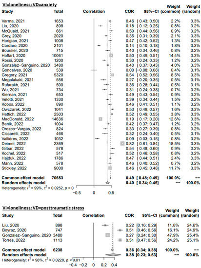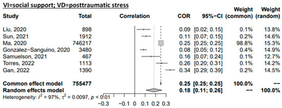 This meta-analysis sought to explore the correlation of social support and loneliness with symptoms of depression, anxiety, and posttraumatic stress during the COVID-19 pandemic. The results show that social support had a weak association with mental disorder symptoms, whereas loneliness had a moderate association with symptoms of anxiety, posttraumatic stress, and, particularly, depression during the COVID-19 pandemic. If we compare the pooled correlations with guidelines for interpreting the magnitude of correlation coefficients [128], we observe the effect of the association between loneliness and mental health outcomes to be in the upper third distribution of correlation coefficients. In all cases, the results were characterized by a high level of heterogeneity.
