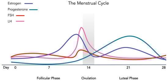 The menstrual cycle is a monthly reproductive cycle regulated by various hormonal concentrations that prepare the female body for pregnancy [1] (Figure 1). The cycle, which on average occurs over the span of 28 days, can be divided into three main phases: the follicular, the ovulatory, and the luteal phase [2]. The follicular phase starts at the beginning of menses and lasts until ovulation [2]. During the early follicular phase, estrogen, progesterone, and luteinizing hormone (LH) concentrations are low, while the follicle stimulating hormone (FSH) level is slightly higher than the previous cycle in order to stimulate the development of the ovarian follicles [3]. During the mid to late follicular phase, estrogen level rises in parallel with the growth of the dominant follicle and reaches its peak prior to ovulation [3]. Ovulation, which occurs around the 14th day of a 28-day menstrual cycle, is stimulated by the surge in LH and FSH levels when the dominant follicle is ruptured and releases the ovum (egg) from the ovary into the fallopian tube [3].