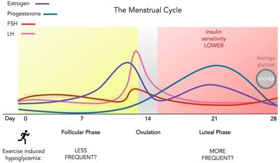 In women without diabetes, a longitudinal study of a large cohort of 257 women showed that insulin and measures of insulin resistance changed over the menstrual cycle, with both reaching maximum levels during the luteal phase [82]. These fluctuations were positively associated with estradiol and progesterone concentrations and negatively associated with FSH and sex hormone binding globulin [82], suggesting that changes in hormonal profile throughout the menstrual cycle may play a role in insulin sensitivity fluctuations in women. Cross-sectional data for 1906 women without diabetes showed cyclic changes in glucose but not in insulin or measures of insulin resistance [83]. After adjusting for body mass index, physical activity, and cardiorespiratory fitness, however, cyclic changes were observed not only for glucose but also for insulin and measures of insulin sensitivity in the study population [83]. This could yet again suggest a role for hormonal changes in insulin sensitivity fluctuation across the menstrual cycle, as body mass index and physical activity are both known to affect ovarian hormonal profiles [84,85].