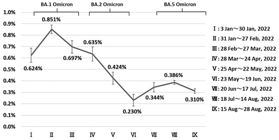 | IX (15 August~28 August 2022) | 117,021 | 254 | 0.310% | (0.290%–0.330%) |