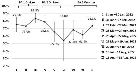 All instances of test-confirmed COVID-19 were required to be reported by the physician to the Public Health Center (a branch of local government) up until 25 September 2022, adhering to the Infectious Diseases Control Law. Most patients were diagnosed by a test for COVID-19 in an outpatient consultation or at hospital admission. Japanese hospitals test almost all patients for COVID-19 before admission for the purpose of prevention of infection spread in hospitals. Antigen tests were approved on 13 May 2020 and had been already distributed in Japan [18]. Individuals who underwent autopsy were tested. The study team collaborated with 10 prefectures (Gunma, Ibaraki, Nagano, Shiga, Gifu, Osaka, Tokushima, Saga, Nagasaki, and Miyazaki) with a total population of 14.84 million residents. We identified study subjects aged ≥40 years of age with newly test-confirmed COVID-19 between 3 January 2022 (the first date of the first week in 2022) and 28 August 2022 (the last date of the 9th week in 2022). Since the case fatality rate among COVID-19 cases with the Omicron variant aged 39 years and younger was considered to be very low [6], we only included cases for those aged 40 years and over in this trend investigation. Japan experienced a sixth endemic wave that was mainly caused by the BA.1 Omicron sublineage and a seventh endemic wave due to the BA.5 sublineage (Figure 1 and Figure A1).