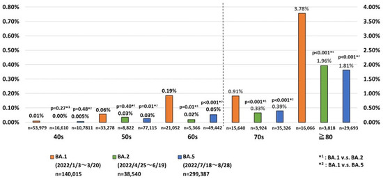 Fatality rates of COVID-19 cases caused by one of three sublineages of the Omicron variant in Japan, 2022 (40s, 50s, 60s, 70s and ≧80 years).