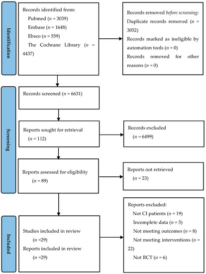 A total of 6631 RCTs were initially identified. Following a review of the titles and abstracts, 89 studies were selected for full manuscript review. Of these, 60 were excluded because they did not fulfil our inclusion criteria. The remaining 29 studies [17,18,19,20,21,22,23,24,25,26,27,28,29,30,31,32,33,34,35,36,37,38,39,40,41,42,43,44,45] were included in this review. The PRISMA chart is illustrated in Figure 1.