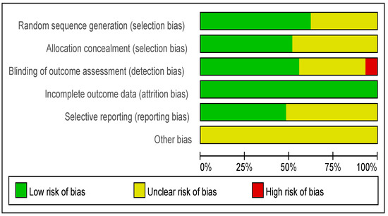 The risk of bias assessment for each individual study is presented in Figure 2. Overall, the studies tended to exhibit a low risk of random sequence generation (62%), allocation concealment (52%), blinding of outcome assessment (56%), incomplete outcome data (100%), and selective outcome reporting (48%), but not blinding of patients and personnel (0%) or other bias (0%).