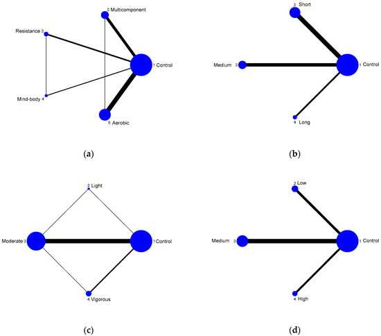 NMA maps of the studies examining the efficacy of exercise in people living with CI on global cognition. (a) exercise type; (b) exercise time; (c) exercise intensity; (d) exercise frequency.