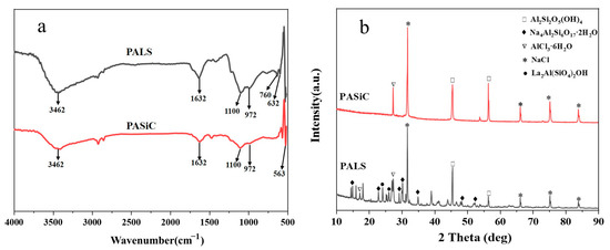 The FTIR spectra of PALS and PASiC are displayed in Figure 3a, whose mole ratios of Al:Si are 3:1 and 1:1, respectively. A strong and wide peak is observed at approximately 3462 cm−1 and a small peak is observed at approximately 1632 cm−1 in PALS and PASiC, which can be associated with the vibration of -OH. The peak at 3462 cm−1 is assigned to the stretching vibration of OH groups, whereas the other is owing to the bending vibration caused by the polymerization, absorption, and crystallization of water molecules in the coagulants [35,36]. Furthermore, the peak at 3462 cm−1 is significantly stronger in PALS than in PASiC, which may be attributed to the higher hydroxylation of Al and La increasing with the higher content of metal ions. Additionally, the peaks located at 1100 cm−1 correspond to the asymmetric stretching vibration of Si-O-Al and Si-O-La [37,38], which indicates that Si is partially replaced by Al and La in two coagulants. Furthermore, the peaks at 972 cm−1 and 563 cm−1 in PALS are attributed to Al-OH flexural vibration and Al-O stretching vibration, respectively [17,32,39]. The peaks between 632 cm−1 and 760 cm−1 are related to La-O and La-OH [38]. The FTIR results revealed that two novel polysilicate coagulants were successfully synthesized, which were covalently complex bound compounds by Al, La, and Si rather than simple physical mixing.