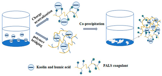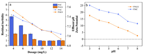 Figure 6a compares the coagulation performance of PALS and PAC in raw water from Ri Hu with different coagulant dosages. PALS performed better at low dosages, and the lowest turbidity was 0.88 NTU. PALS had more of an effect on effluent pH, which may be attributed to the introduction of polysilicic acid and sufficient hydrolysis of Al3+ and La3+. Although PAC was more positively charged than PALS, as shown in Figure 6b, favoring a stronger charge neutralization ability in coagulation, PALS performed better in that it may have a promising adsorption bridging and sweep trapping ability and work together to synergize water treatment.