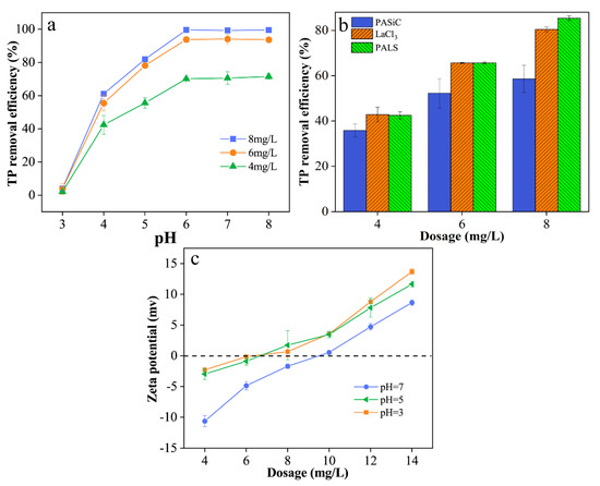 TP removal efficiency at pH = 3–8 by PALS with initial phosphate concentration = 2 mg L−1 (a); TP removal efficiency by PASiC, PALS, and LaCl3 at dosages of 4–8 mg L−1 with initial phosphate concentration = 5 mg L−1 and pH = 7.8 (b); zeta potential of flocs at dosages of 4–14 mg L−1 with PALS (c).