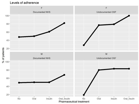 Figure 2 deepens this difference by observing the adherence levels of the population characterized in terms of sex and therapy. For both groups, different pharmaceutical treatments correspond to rather different adherence levels. In particular, a gradient that associates more complex therapeutical treatments to higher adherence seems to exist, which is recurrent for Undocumented OSF vs. Documented NHS, and for male as for female. Adherence levels for patients not subjected to pharmaceutical treatment are less than 30% and appear to be very similar in the Undocumented OSF and Documented NHS groups. However, the association between adherence and complexity of the therapy appears more pronounced for Undocumented OSF patients. Figure A1 provided in the Appendix A deepens the same variables in relation also to age. Even if it seems that younger patients are more adherent than older, the trend is not straightforward. Eventually, few categories of Documented NHS appear to be more adherent than their corresponding Undocumented OSF.