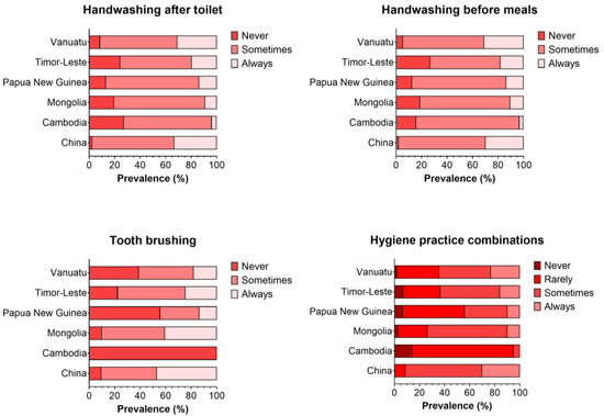 From the original 8296 children included in the EAP-ECDS study, 6697 had complete data available on the exposures (the three hygiene practices included), outcomes (domains included), and covariates (Figure S1). The overall characteristics of the children included by the individual hygiene practice classifications (never, sometimes, always) are shown in Table 1. 13% and 14.2% of the caregivers reported that their children ‘never’ washed their hands before their meals or after going to the toilet, while only 18.2% and 19.1% ‘always’ followed this practice, respectively. In contrast, a higher proportion of children ‘always’ brushed their teeth (27.3%), even though over one-third of children never brushed their teeth. Overall, children who ‘never’ followed any of the individual hygiene practices investigated were younger, more likely to be boys, and tended to come from rural areas and lower SES families (Table 1). Regarding the country of origin, a higher percentage of Chinese children always followed the three hygiene practices investigated (33.3%, 29.8%, and 47% always washed their hands before meals, after going to the toilet, and brushed their teeth, respectively). In contrast, Cambodian children had the highest prevalence of ‘never’ following this practice, especially for the tooth brushing practice (100% declared ‘never’ brushing their teeth; Figure 1). General characteristics by combined hygiene practice classifications are shown in Figure 1 and Figure S2 and Table S1.