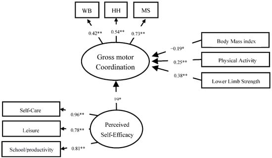Children with DCD motor coordination model: BMI, PA, lower limb strength, and self-efficacy. Note: WB: walking backward along a balance beam; JS: jumping sideways over a slat; HH: hopping for height on one foot; MS: moving sideways on boards. * Statistically significant at p < 0.05. ** statistically significant at p < 0.001.