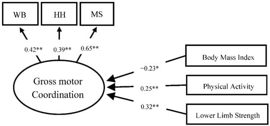 Regarding the models, for children with DCD, the models showed adequate adjustment indexes, and the BMI significantly and negatively affected motor coordination. In contrast, physical activity, lower limb strength, and perceived self-efficacy explained positively and significantly the gross motor coordination; the study hypothesis was confirmed. The model had to be respecified for children with TD, and self-efficacy was excluded. Therefore, BMI explained motor coordination negatively and significantly, whereas physical activity and lower limb strength explained the variability in gross motor coordination positively and significantly. The hypothesis was partially confirmed.