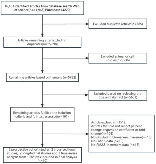 The article filtering process is shown in Figure 1. After the initial literature search, we identified 16,183 studies. After excluding 885 repetitive literature works, 15,298 studies were preliminarily screened. After that, we excluded 9536 articles on animals and cells. According to the criteria for induction and exclusion, and the review of literature titles and abstracts, 5601 articles did not meet the inclusion criteria. Finally, we reviewed the remaining 161 articles and found that 151 articles did not qualify. The reasons were as follows: articles that did not report percent change, regression coefficient, or fold change (n = 108); no circulating biomarkers measure (n = 18); no PM2.5 data (n = 10); and no PM2.5-increment data (n = 15). The remaining ten studies, including five cohort studies [3,5,9,10,11], two cross-sectional studies [14,22], two longitudinal studies [24,25], and one time-series analysis [26], were included in the final analysis.