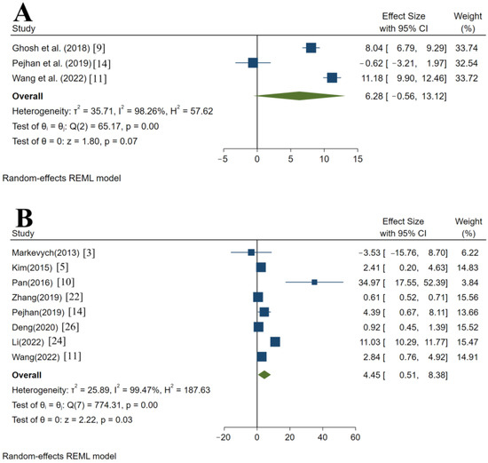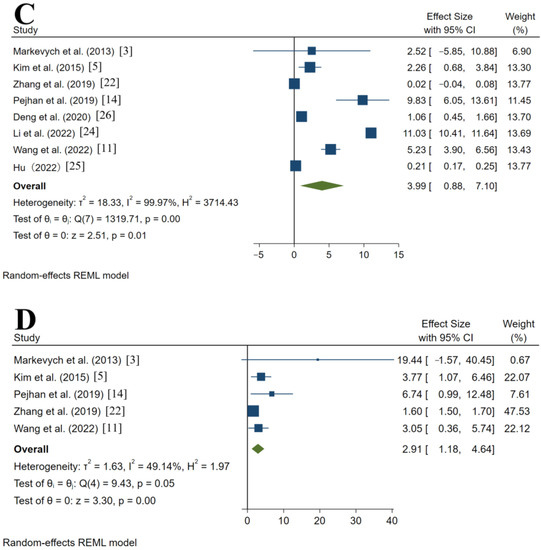 Heterogeneity was observed among studies investigating ALP (I2 = 98.26%, p = 0.07), ALT (I2 = 99.47%, p = 0.03), AST (I2 = 99.34%, p = 0.01), and GGT (I2 = 49.14%, p < 0.001).