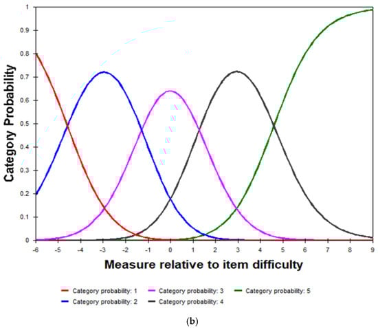 Regarding construct validity, Rasch model analysis was conducted to determine the item fit, item difficulty parameter, item response category curves, separation index (SI), and reliability index (RI). The mean square (MNSQ) value was calculated and verified to determine the suitability of the model fit and evaluate whether an item satisfies the assumption of unidimensionality. If infit MNSQ value was satisfied from 0.5 to 2.0 and the point-measure correlation value was greater than 0.4, the model was interpreted to be appropriate at a suitable level [,]. Regarding the difficulty parameter of items, higher logit values of the measurement indicated more difficult items, and lower logit values indicated the easier items. The goodness of fit of the response category on the 5-point Likert scale was verified through item response category curves. SI ≥ 2.0 indicates that the unidimensionality of the item is suitable, and RI ≥ 0.80 is interpreted as satisfying the internal consistency of the scale [,].