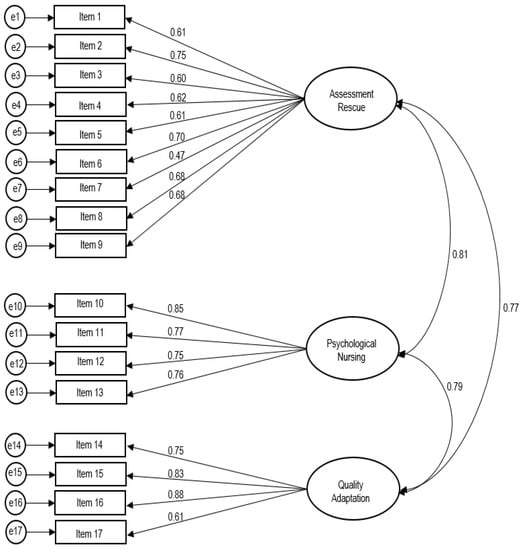 CFA was conducted to analyze construct validity. The commonality of the 17 items was from 0.41 to 0.82, which satisfied the criteria. The goodness-of-fit indices in the results of the analysis were found to be suitable. The model fit was achieved at an acceptable level, as follows: χ2/df = 2.20 (p < 0.001), Comparative Fit Index (CFI) = 0.92, Incremental Fit Index (IFI) = 0.92, Tucker-Lewis Index (TLI) = 0.91, Adjusted Goodness-of-Fit Index (AGFI) = 0.82, and Root Mean Square Error of Approximation (RMSEA) = 0.07 (Figure 2).