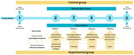 EG: A multicomponent cognitive-behavioural four-week program (one session per week) will be carried out. This program will be developed over four weekends and will consist of outings to the Jerte Valley for participation both in therapeutic tourism through adventure physical activities and psychological therapy, so every session will be divided into two parts: the psychological component with a one-hour session of group therapy on different psychological and social aspects, conducted by clinical psychologists specializing in IPV and will prepare the women for the adventure activity; and a second part which will consist of different adventure activities, conducted by sport sciences professionals, with an approximate duration of three hours (Figure 1). If necessary, children may accompany their mothers during the intervention. These will be cared for by specialized monitors so that their mothers can carry out the planned activities.