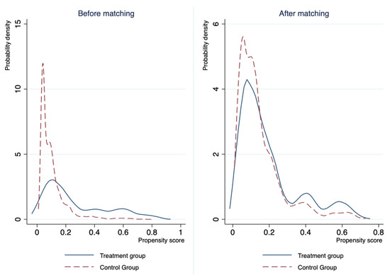 The density distribution of the propensity score between the treatment and control groups before and after PSM is depicted in Figure 1. The solid curves denote the possibility of migrating from the pilot areas during the land reform for the migrants in the treatment group, which is estimated by a logistic regression. The dashed line curves denote the possibility of migrating from the pilot areas during the land reform for the migrants in the control group, which is estimated by a logistic regression. The PSM has eliminated the significant distribution differences that existed before PSM, indicating that our PSM estimation is reliable.