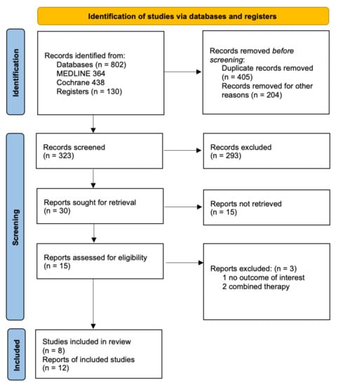 We retrieved 932 records from the search of the electronic databases and screened a total of 323 records (Figure 1). We reviewed full copies of 15 reports and identified 12 with the potential for meeting the review inclusion criteria. We excluded three records because they included combined mindfulness–body exercise therapies [41,42] or showed no outcome of interest [43].