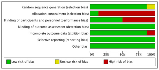A low risk of bias for incomplete outcome data was assessed for seven trials [44,45,46,47,48,50,51]. Two trials described no missing data [47,48], three trials had dropouts in the intervention group below 20% [44,46,51], two trials carried out an intention-to-treat analysis by analyzing the participants according to the group to which they were initially assigned [49,50]. One trial reported a high risk of bias for incomplete outcome data because there were missing data for 30% of the intervention group [45]. There was no evidence for selective reporting bias because it was clear that all pre-specified outcomes of interest were reported in the studies, including those that involved published protocols.