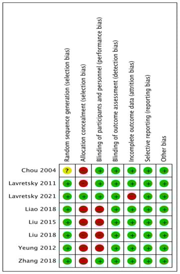 Four trials had a low risk for performance bias because the blinding of the participants and personnel was described [44,45,46,51]. The participants were blinded through random assignment into groups [51]; by randomization status [46]; or blinded to the study objectives, randomization status, and outcomes [44,45]. Four trials reported that the participants were not blinded in the trials, although the research personnel were blinded to the randomization status. Because the outcomes were likely to be influenced, we considered these cases to be at high risk for performance bias [47,48,49,50]. The detection bias was judged as a low risk because the blinding of the outcome assessment was described in all eight trials [44,45,46,47,48,49,50,51].