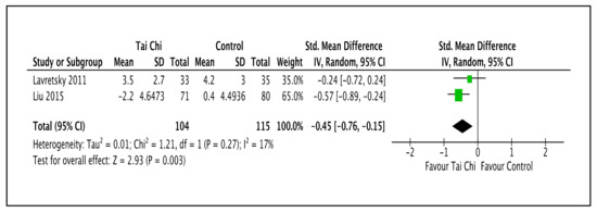 As shown in Figure 5 and Table 2, for anxiety level outcomes, two trials reported that the Tai Chi intervention reduced anxiety compared to the control group (SMD −0.45; 95% CI −0.76 to −0.15; I2 = 17%; p = 0.003; two trials; 219 participants; low-quality evidence) [44,49].
