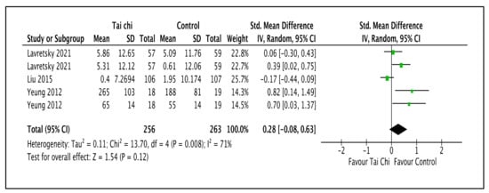 Forest plot shown for comparison of Tai Chi versus no intervention for mental-health-related QOL outcomes [47,51]. Note: Line indicates confidence interval and the green square indicates effect estimate. Black diamond indicates cumulative effect and its confidence interval.