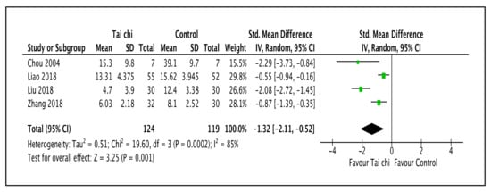 As illustrated in Figure 8 and Table 3, the review reported that the Tai Chi interventions reduced the depressive symptom severity when compared to the control group (SMD −1.32; 95% CI −2.11 to −0.52; I2 = 85%; p = 0.001; four trials; 243 participants; very low-quality evidence) [46,47,48,51]. A subgroup analysis based on duration and styles of Tai Chi could not be performed because of the limited number of trials. A sensitivity analysis with all trials showed no changes in effect sizes.
