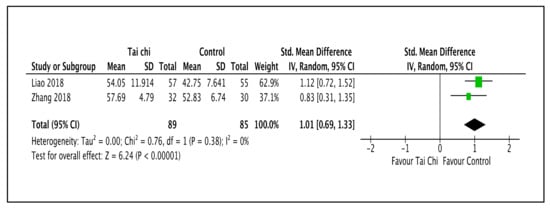 As shown in Figure 9 and Table 3, Tai Chi increased the mental-health-related QOL compared to the control group (SMD 1.01; 95% CI 0.69 to 1.33; I2 = 0%; p < 0.001; two trials; 263 participants; low-quality evidence) [47,51].