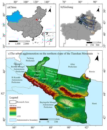 The UANSTM is in the southern section of the Junggar Basin, with geographical coordinates 42°78′~45°59′ N and 84°33′~90°32′ E. The Tianshan North Slope Economic Zone includes Urumqi City, Changji Hui Autonomous Prefecture, Turpan City, Wujiaqu City, Karamay City, Shihezi City, Wujiaqu City, Kuitun City, Huyanghe City, Tacheng Prefecture (including only Wusu City and Shawan County, the same below), and Corps and regiments (Figure 1), with a land area of about 1.9 × 105 km2, accounting for 12% of the total area of Xinjiang. The climate of the research region is temperate continental, with scarce rainfall, ample sunlight, significant evaporation, and huge daily and yearly temperature fluctuations. With the Turpan Basin to the south and the Gurbantunggut Desert to the north, the UANSTM is distinguished by diverse landscapes, including the Gobi, the desert, the mountains, and the basin. The overall topography is high in the middle and low in the north and south.