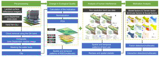 The idea of this research is shown in Figure 2. Firstly, preprocessing and RSEI index calculations are carried out in the GEE platform, while LULC and human interference (HI) are analyzed, and finally, the influencing factors of the RSEI are analyzed.