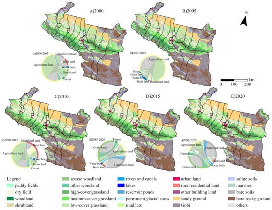 A LULC-type conversion proportional chord diagram was produced based on the change in LULC type; mapping the process of conversion to itself was removed the spatial interconversion of land was highlighted. In the period 2000–2005, many natural LULC types, such as grassland, woodland, water, and bare soil, were converted to agricultural land, with a small proportion converted to urban areas; from 2005 to 2010, agricultural land expanded further. The trend of urbanization is evident from 2010 to 2015, accounting for a relatively large proportion of the interconversion of LULC. The expansion of agricultural land slows down during the period 2015–2020, and the conversion of diverse LULC types to grassland is the main direction of spatial movement of land during this period. In terms of the overall change over the 20 years, the conversion of each LULC type to grassland, represented by unutilized land, is the direction of flow that accounts for the largest share, followed by the conversion of each type to agricultural land, forest and water areas being exported outwards, and towns being imported inwards.