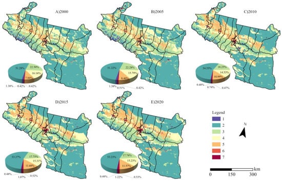 In the distribution pattern of anthropogenic disturbances in the UANSTM from 2000 to 2020, the proportion of grade 2 anthropogenic disturbances is always the largest, stable between 50% and 55% (Figure 4). Grade 6 and grade 7 anthropogenic disturbances were previously the smallest, however, they both increased with urbanization. Grade 7 rose higher than grade 6, which shows that urban expansion is rapid and greater than township expansion. grade 5 also expanded extremely rapidly, caused by the growth of agricultural land. Grade 5 is also expanding very fast, caused by the increase in agricultural land. It is worth noting that the fraction of anthropogenic disturbances at grade 1 has shrunk significantly, and glaciers are diminishing rapidly.