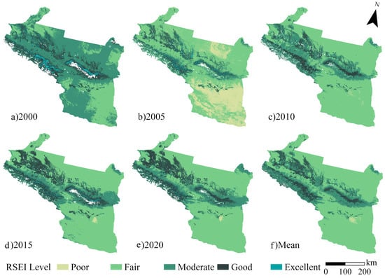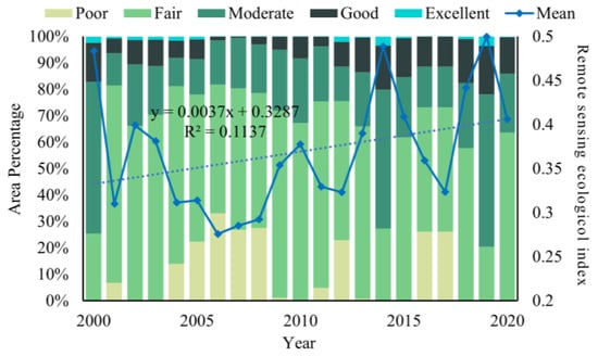 On the time scale, the RSEI values fluctuate considerably, with an overall upward trend (Figure 6). There was a ‘fair’ ecological rating for most of the period 2000–2020, with values fluctuating between 0.28 and 0.38; a few years were in the ‘medium’ ecological class, as was the case in 2000, 2014, 2018, and 2019, with RSEI values of 0.48, 0.49, 0.44, and 0.50, respectively. In addition, four years had RSEIs at the ‘fair’ and ‘moderate’ thresholds.
