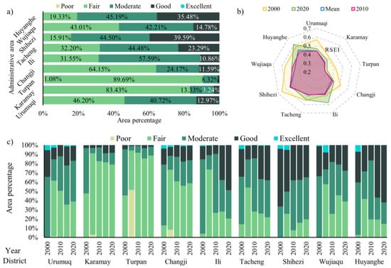 Ecological quality of localized areas. (a) Distribution of multi-year RSEI means in different administrative units. (b) Annual RSEI for different administrative units. (c) Corresponding proportion of RSEI grades and administrative regions of the UANSTM.
