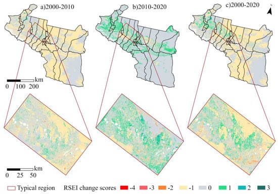The RSEI distribution for each decade was spatially overlaid to estimate the ecological changes in the UANSTM over each decade (Figure 8). Large regions of overall regional change were found to be concentrated in unused areas such as the desert and Gobi, with smaller portions and high fragmentation in oasis cities and the Tianshan Mountains’ forest. One of the characteristics of the UANSTM is that natural LULC patterns account for a fairly large proportion of the region, while oasis cities, where human activities are common, account for a relatively minor fraction. A more in-depth assessment of the usual areas of significant change picked from the RSEI change map (referred to as Typical Region) demonstrates that oasis cities (especially areas with rapid urban expansion) have small footprints but large ecological changes, often below −2 or above 2 levels.