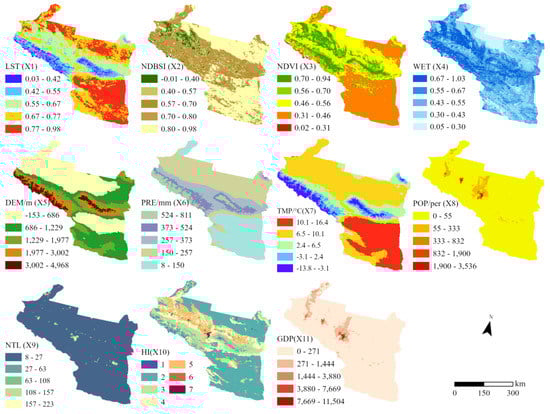 RSEI is composed of WET, NDVI, LST, and NDBSI (Table 5), where WET represents the humidity of the region and is derived from the tassel cap transformation. The greenness, humidity, and brightness components of the tassel cap transformation have been widely used in ecological monitoring studies [] and the humidity component is closely related to soil moisture. Normalized difference vegetation index (NDVI) represents the vegetation greenness of the region and is the most widely used vegetation index. Land surface temperature (LST) represents the surface temperature and is calculated based on the Landsat user manual model and the surface temperature of the parameters revised by Chander et al. []. Soil drying has a negative effect on regional ecology and urban built-up areas can also contribute to soil drying []. Normalized Difference Built-up and Soil Index (NDBSI) combines the soil index (SI) and the building index (IBI) to represent regional dryness.