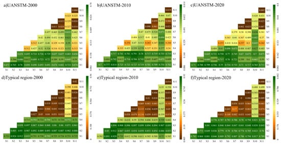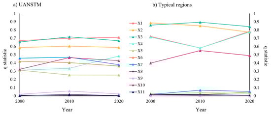 A higher q statistic suggests a stronger impact for the dependent variable. Comparing the strength of the factor influence for the region as a whole and a typical region, the strength of the impact is found to vary considerably at different scales (Figure 10). At the scale of the UANSTM, model factor > climate factor > topography factor > social factor, X1 and X3 have the greatest influence, whereas X8, X9, and X11 have a weak influence. This shows that surface temperature and vegetation greenness have a substantial impact on the overall ecological environment of the region and that social factors other than HI have a minor effect. Except for X11 in 2000 and X8 in 2020, the p-values for all factors are less than 0.01, which implies that the vast majority of the explanatory results for the impact factors are reliable.