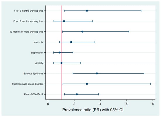 In the simple model (Table 3), the factors associated with a higher prevalence of eating disorder symptoms were working time, insomnia (PR: 2.71; CI 95%: 1.67–4.42), fear of COVID (PR: 3.36; CI 95%: 2.05–5.49), presenting burnout syndrome (PR: 2.39; CI 95%: 1.32–4.33), anxiety (PR: 2.50; CI 95%: 1.53–4.09), depression (PR: 1.91; PR: 1.17–3.14) and post-traumatic stress (PR: 4.14; CI 95%: 2.47–6.92) (Table 3). In the multiple regression model, we found that military personnel with work time between 7 to 12 months and 19 months or more had 197% (PR: 2.97; CI 95%: 1.24–7.11) and 162% (PR: 2.62; CI 95%: 1.11–6.17) higher prevalence of eating disorder symptoms, respectively. Fear of COVID increased the prevalence of eating disorder symptoms by 120% (PR: 2.20; CI 95%: 1.26–3.85) Additionally, military members with burnout syndrome and post-traumatic stress disorder presented 273% (PR: 3.73; CI 95%: 1.90–7.33) and 197% (PR: 2.97; CI 95%: 1.13–7.83) higher prevalence of eating disorder symptoms, respectively (Figure 2).