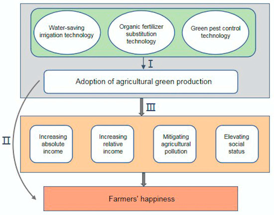 In economics, happiness is often portrayed as utility. In psychology, it is referred to as subjective welfare [57]. Both reflect one’s subjective evaluation of one’s own life as a whole [58]. A country should not just be concerned with economic progress but also the emotions of its residents. This is a significant topic worthy of attention and investigation. In this paper, our focus is on the link between the adoption of agricultural green production and farmers’ happiness(Figure 1).