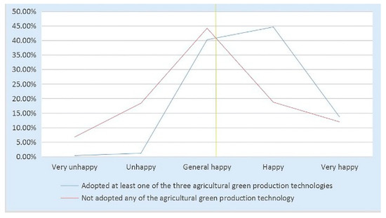 The association between farmers’ adoption of agricultural green production and their happiness is represented in Figure 5. A total of 77.94% of the sampled farmers implemented at least one of the three agricultural green production technologies. In this group of farmers, 0.34% of households regarded themselves to be very unhappy, 1.13% of households considered themselves to be unhappy, 40.25% felt generally happy, 44.64% felt happy, and 13.64% felt very happy. Amongst the respondents, 22.06% of farmers had not adopted any of the three agricultural green production technologies. In this group of farmers, 6.73% of farmers considered themselves very unhappy, 18.37% of farmers felt unhappy, 44.22% of farmers felt generally happy, 18.73% of farmers felt happy, and 11.95% of farmers felt very happy. The proportion of happy farmers in these two groups demonstrates that those who implemented environmentally friendly agricultural practices were happier than those who did not.