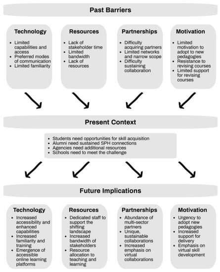 Finally, schools and faculty have been resistant to changing the status quo when the structure seems to be working or when the changes require a good deal of effort or resources without guarantees the changes will be effective. Whether we are ready or not, the current context of both PH programs and the field is motivating us to change our pedagogies to quickly produce competent students with prior field experience and who are workforce ready. Students have had to embrace technology as part of their learning platform given the restrictions from the COVID-19 pandemic and the resulting shift toward virtual learning and virtual workforce positions. Agencies have had to pivot and shift resources to meet the changing needs of the populations they serve [,]. Faculty have had to revise courses for maximum effectiveness delivered virtually, online, or in a hybrid setting to meet a shifting demand for virtual and distance learning []. SPH have had to recognize that pedagogies that previously worked may no longer suffice in post-COVID-19 times. All stakeholders have had to evolve and adapt to find innovative, cost-effective, and sustainable solutions to pressing problems in real time. This is the hallmark of PBT courses, which results in deliverables that are targeted, implementable, and innovative and partnerships that are sustainable and impactful.