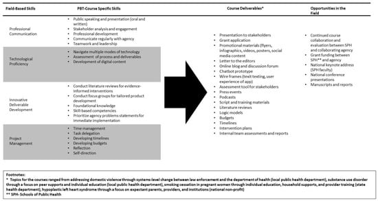 Given the urgency for experienced PH professionals felt in response to COVID-19, students are seeking educational opportunities that allow maximum skill acquisition (Figure 2) regardless of mode of course delivery and that allow exploration of where they fit into the system []. SPH that utilize PBT allow students to obtain skills far beyond what a traditional course teaches, which gives them the confidence to innovate and take risks to develop sustainable solutions, demonstrates how they can immediately serve the field, and exposes them to relevant issues that may be outside their interest or region but that require real effort to solve. It also gives a space for students to try new ideas and innovations and collaborating agencies a space to learn new approaches. PBT creates opportunities and connections between students and agencies, thereby streamlining the entrance of trained PH graduates into the field.